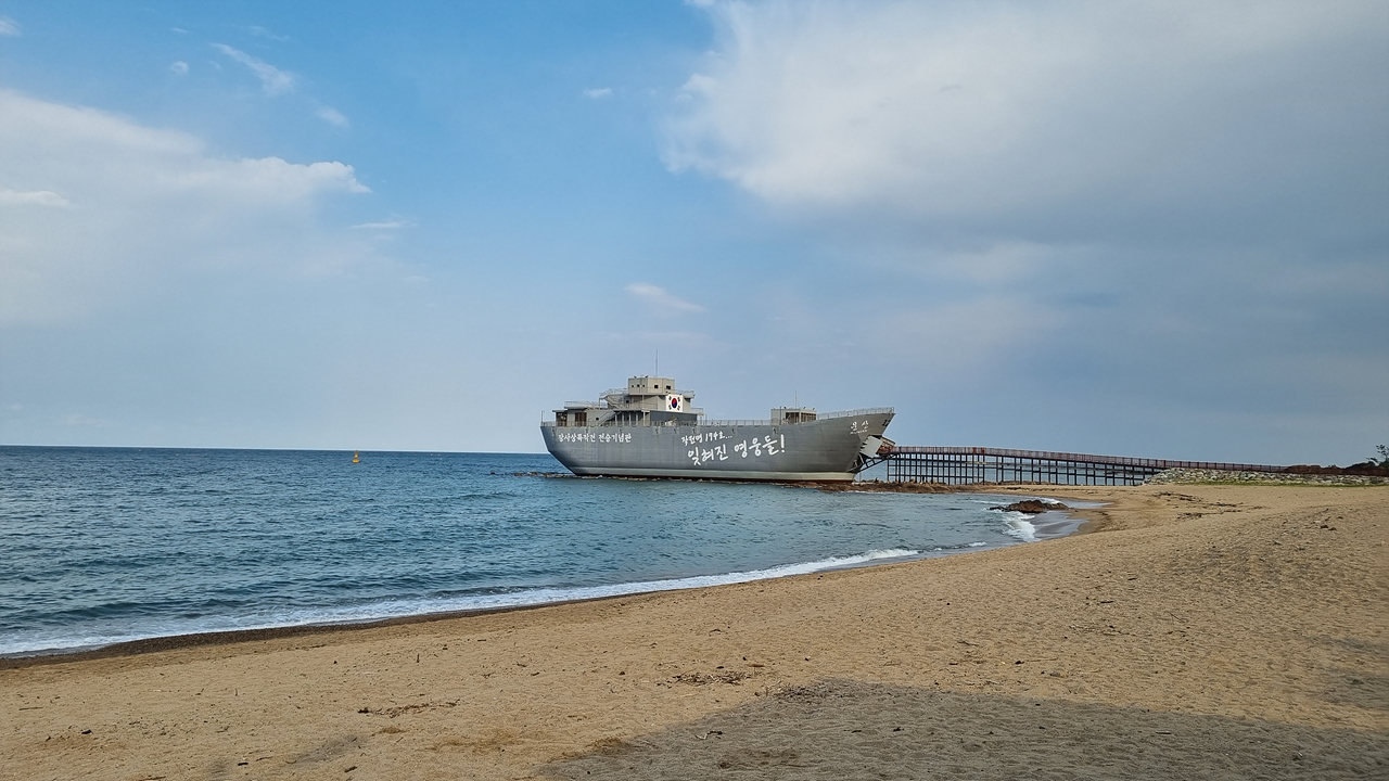 쌩뚱맞은 배.. 장사상륙작전 기념관이다.
