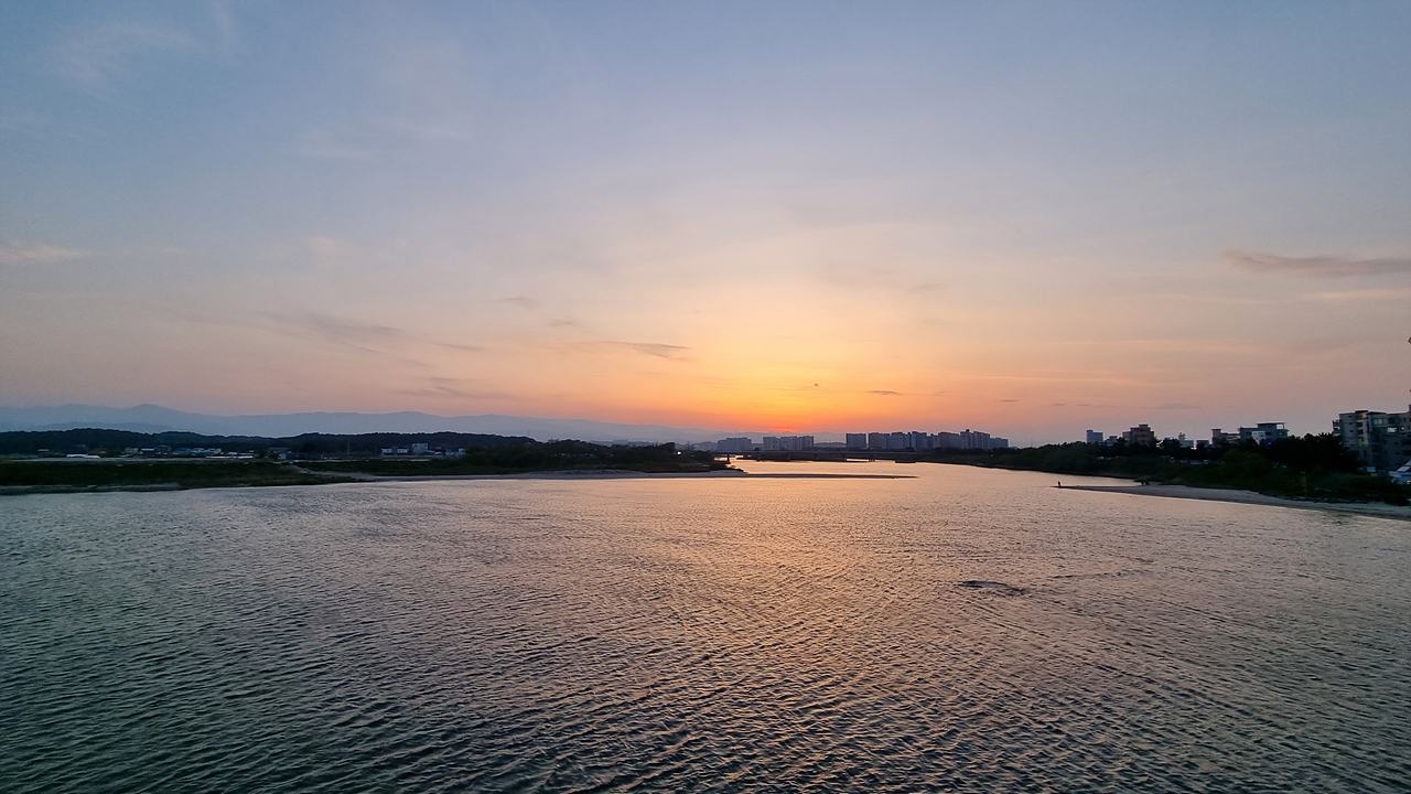 강릉 남대천 다리 위에서 찍은 해 떨어지는 강릉항 풍경